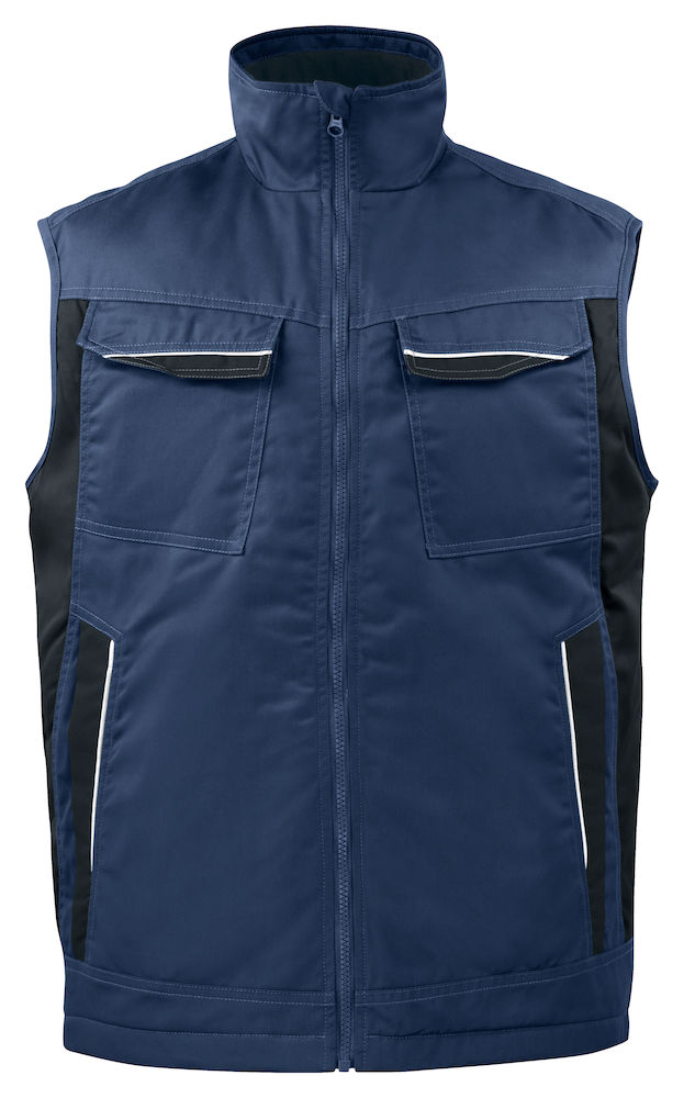 65% polyester/35% katoen, 245 g/m², wattering: 100% polyester, gevoerde service vest in een easycare materiaal polyester/katoen , goed kleurbehoud , twee borstzakken , D-ring voor ID-kaarthouder , ritssluiting in de kraag met stormflap en kinbescherming , voorzakken met verstevigingen in polyamide , verlengde rug , linker binnenzak voor mobiele telefoon, rechter binnenzak met velcrosluiting , reflectoren aan de voor- en achterkant