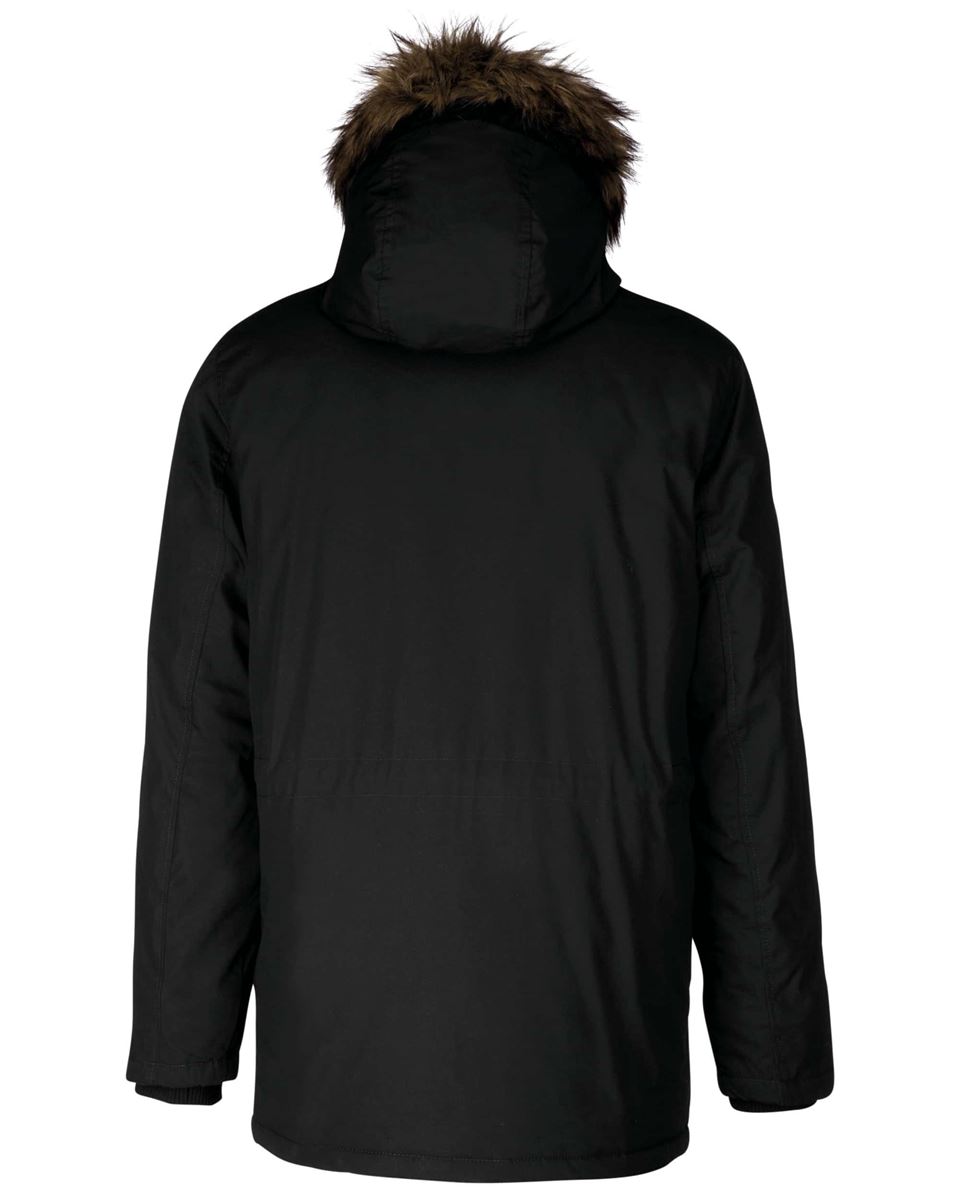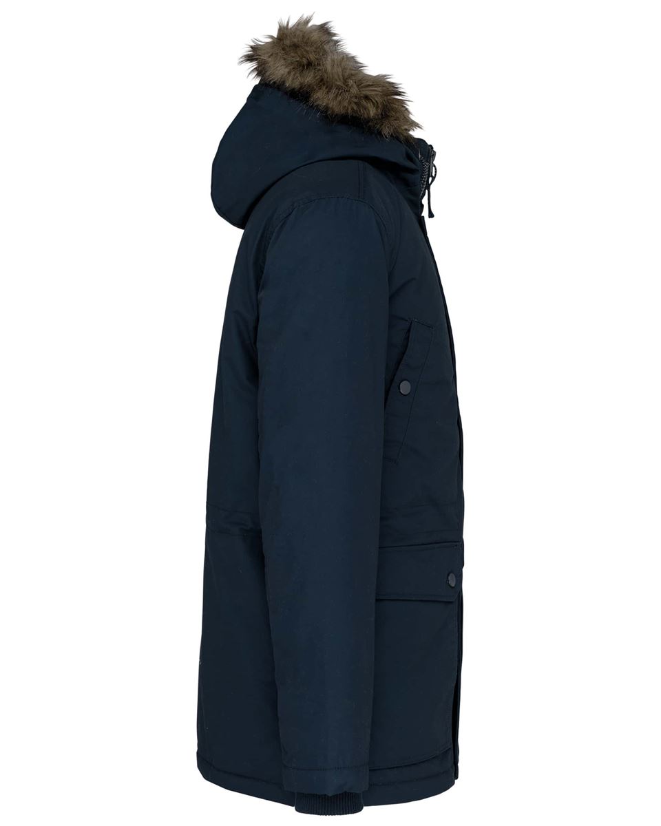 Dik canvas van 65% polyester / 35% katoen. Gewatteerde voering van 100% polyester. Verborgen ritssluiting onder een drukknooplijst. Gawatteerde en gevoerde capuchon met afneembaar nepbont. 4 buitenzakken aan de voorkant: 2 grote zakken met dubbele opening met klep met drukknoop en 2†omzoomde borstzakken met drukknoop. 1 binnenzak met klittenbandsluiting. Taille verstelbaar met aanrijgkoordjes binnenin. Mouwuiteinden in ribboord aan de binnenzijde. 1 rits aan de linkerkant en 1 drukkersrits.